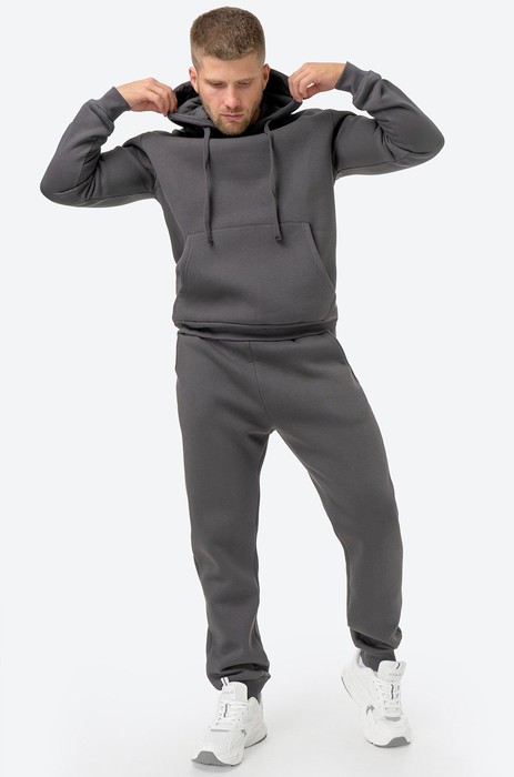 Надежный спутник спорта, туризма и отдыха на природе! Теплый мужской костюм графитового цвета выполнен из качественного трикотажа футер с начесом. В комплекте толстовка с капюшоном и брюки джоггеры.