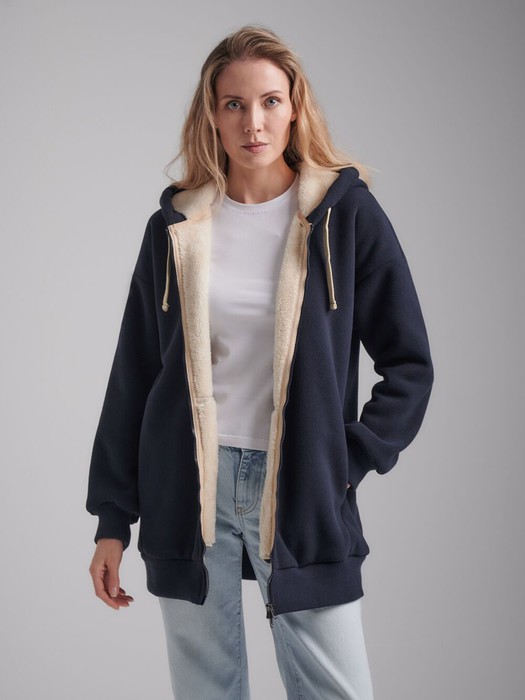 Толстовка женская из плотного флиса, дублированного мехом. Изделие с удобным капюшоном, низ тостовки заужен трикотажным поясом. Карманы в боковых рельефах. Застегивается на молнию. Рукава втачные, с эластичными манжетами.