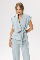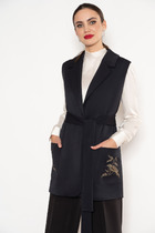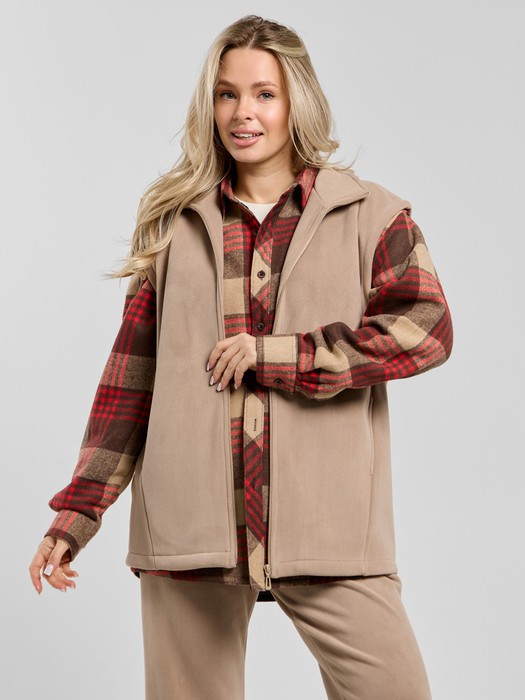 Жилет молодежный из трикотажного полотна «дабл-флис» (двухсторонний флис), прямого силуэта, с воротником «стойка», центральной бортовой застежкой на тесьму «молния». Для создания диагональных линий боковые швы переведены на полочку и оформлены в рельефные швы, в которых обработаны карманы.
