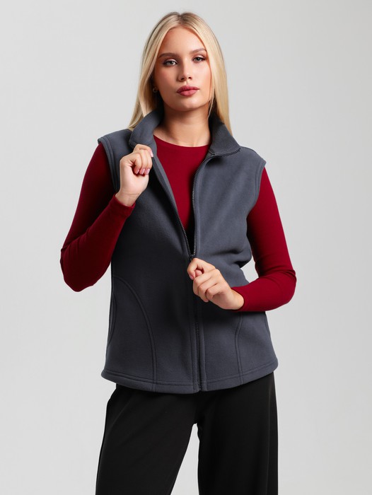 Жилет молодежный из трикотажного полотна «флис», полуприлегающего силуэта, воротником «стойка», карманами в боковых швах фигурной формы, центральной бортовой застежкой на тесьму «молния».
