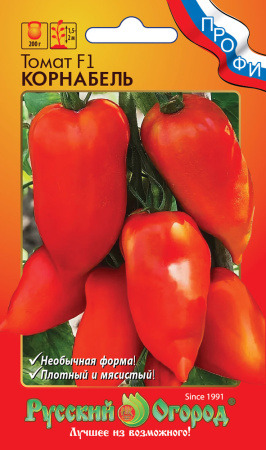 Этот сорт не только украсит любой приусадебный участок, но и порадует своим превосходным вкусом. Томат Корнабель - индетерминантный, кистевой сорт, выведенный французскими селекционерами. Срок созревания плодов составляетоколобОдней.с момента высаживания рассады в грунт. Подходит для возделывания как в открытом грунте, так и парниковых условиях, поэтому может выращиваться по всей территории России. Плоды завязываются кистями по 7 штук. Помидоры имеют вытянутую, заострённую форму, напоминающую болгарский перец. Размеры плодов довольно большие — длина до 15 см, средняя масса 180-200 г. Вкусовые качества этого сорта выше всяких похвал. Отличный вкус плодов как в све¬жем виде, так и при консервации. Среди основных преимуществ можно выделить такие: