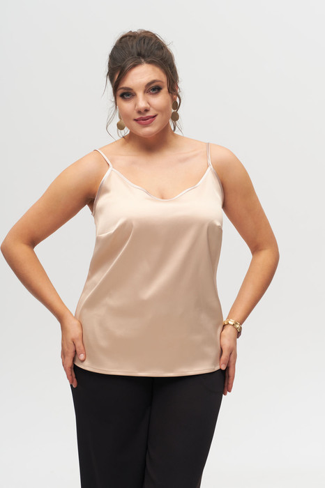 Топ женский, полуприлегающего силуэта, длина до середины бедра. По переду V-образный вырез, нагрудные вытачки. По спинке талиевые вытачки. Топ на брителях с регуляторами.