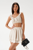 Блузон в крое трапеция, выполнен из струящейся ткани молочного цвета. Характеристика: крой трапеция - расширяется к низу, широкие бретели, спереди v-образный вырез, по спинке овальная горловины, спинка изделия чуть удлиненна, по низу изделия белое кружево, хлопковая подклада в виде топа на резинке. Длина изделия по центру спинки 63см ( с учетом кружева).