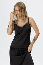 Атласная блузка-топ на регулируемых бретелях прямого силуэта, на широкой обтачке. Полочка с V-образным вырезом и нагрудной вытачкой. По низу блузки кружево.