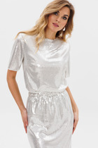 Джемпер выполнен из трикотажа с блеском. Джемпер приталенного силуэта, длиной выше линии бедер. В среднем шве застежка на потайную молнию, Воротник-стойка. Плечевой шов удлинен. Джемпер на плечевых накладках.