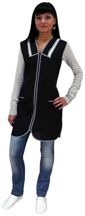 Сарафан с центральной застежкой на молнию, с боковыми накладными карманами. Окантовка из ткани в контрастную полоску. Рекомендуется для работников торговли, сферы обслуживания, технического персонала гостиниц.