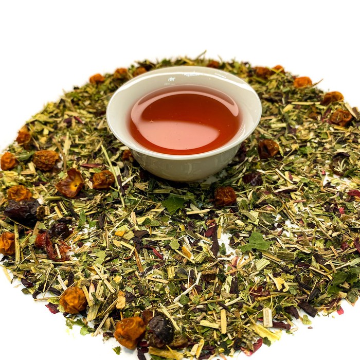 Крапива, липа, шиповник, душица, зверобой, рябина, лист смородины, гибискус. Без ароматизаторов.