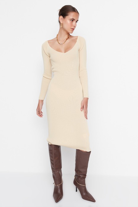 TRENDYOLMİLLA Bej Sırt Detaylı Triko Elbise TWOAW22EL0556