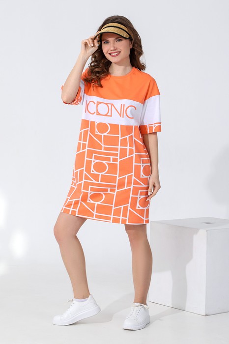 Туника молодежная из трикотажного полотна «кулирка» в комбинации из двух видов ткани: с набивным рисунком и гладкокрашеной. Прямого силуэта, с коротким втачными рукавами, горловиной овальной формы, обработанной притачной бейкой и принтом на полочке, выполненным в технике «шелкографии».