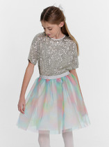 Плиссированная юбка из трикотажа с ярким набивным принтом. Талия на резинке. Трикотажная подкладка.На ребенке представлен размер 110:- Ширина изделия по линии талии 24,5 см- Ширина по низу изделия 73,5 см- Длина изделия 26 смРазница между размерами составляет 1,5 см.
