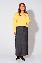Юбка с элементом запаха, на притачном поясе. Выполнена из костюмной ткани в чёрном цвете, без подкладки. В новейших моделях запах располагается спереди сбоку. Это формирует изящный вырез треугольной формы, который смотрится очень женственно.
