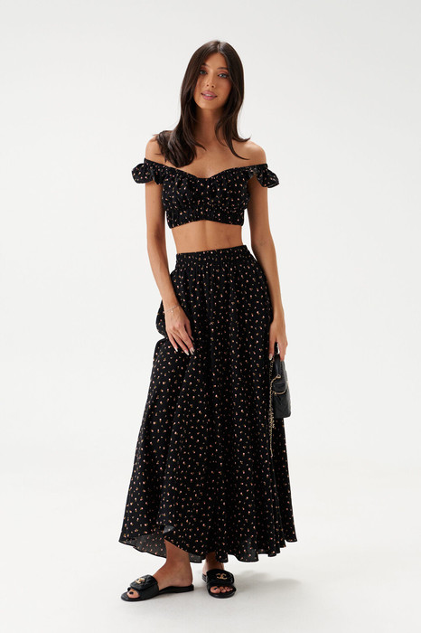 Юбка кроя полусолнце, выполнена из полотна черного цвета с цветочным принтом.Характеристики: крой полусолнце, без подкладки, по бокам изделия швы, пояс на резинке со сборкой. Длина юбки 97 см.