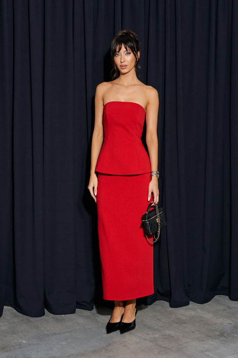 Юбка прямого кроя. Выполнена из костюмной ткани. С подкладкой. Пояс стабильный. В среднем шве заднего полотна разрез (49 см). Застёжка молния в среднем шве заднего полотна. Длина юбки 96 см