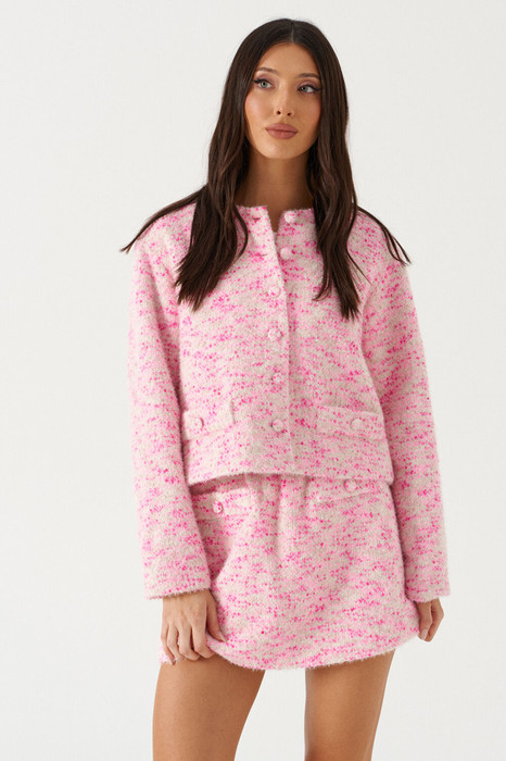 Юбка кроя-трапеция, выполнен из твидовой ткани бежево-розового цвета. Характеристика: крой трапеция, пояс на скрытой резинке, брендированный подклад, спереди изделия имитация карманов. Длина по боковому шву 36 см.