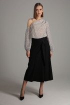 Стильная мини юбка выполнена из полотна шоколадного цвета с принтом горох. Характеристики: свободный крой, пояс на резинке, низ изделия – подгиб на резинке. Длина 46 см.