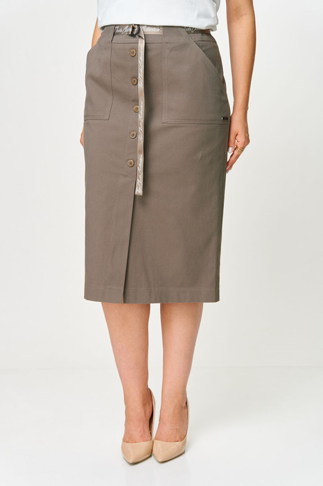 Юбка женская из хлопковой ткани. На подкладке, прямого силуэта, заужена к низу. Притачной пояс-кокетка, настрочены по переду накладные карманы и обработана по центру планка, которая заканчивается шлицей. Спинка со средним швом и талиевыми вытачками. В среднем шве застежка на потайную тесьму-молнию. К юбке прилагается пояс. Длина юбки по боковому шву 68 см.