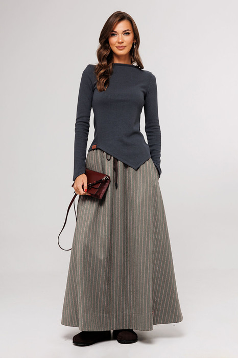 Юбка длинная из костюмной ткани А-силуэта на притачном отсроченном поясе на резинке со втянутым в него шнурком с наконечниками и карманами в боковых швах. По переду внизу нашивка "BUTER". Юбка без подкладки