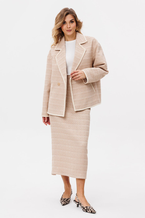 Юбка выполнена из твида. Юбка заужена к низу, на притачном поясе, длиной ниже линии колена. Застежка сзади на потайную молнию и пуговицу. Сзади в среднем шве разрез. Юбка на отлетной по низу подкладке.