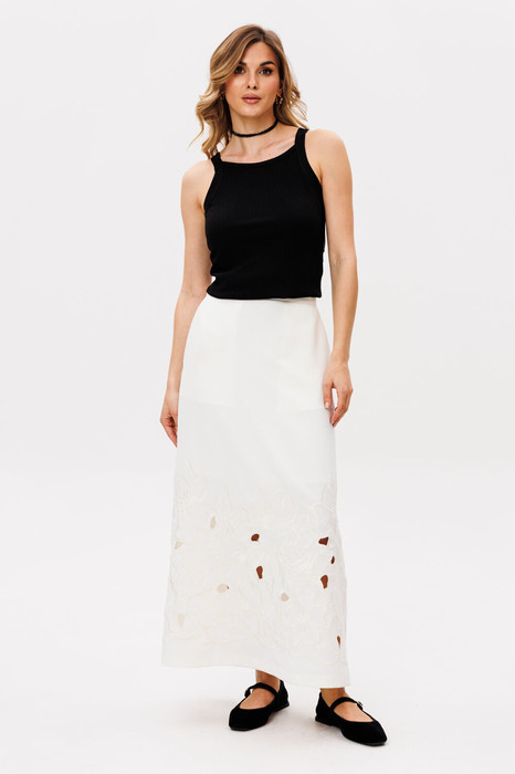 Юбка выполнена из плательной ткани. Юбка А-образного силуэта, длиной миди. Юбка на притачном поясе. Сзади в среднем шве застежка на потайную молнию. В боковых швах карманы с наклонным входом. Юбка декорирована по низу переда вышивкой с перфорацией. Юбка на отлетной по низу подкладке.