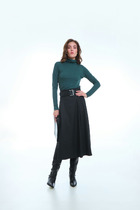 Юбка выполнена из плотного атласа. Юбка расширенная к низу, на притачном поясе, длиной миди.Переднее и заднее полотнища цельные и выкроены по косой. Застежка в левом боковом шве на потайную молнию и пуговицу. Юбка без подкладки.