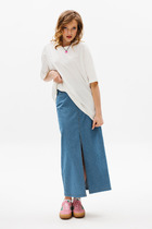 Юбка прямая, макси, на притачном поясе со шлёвками. Застёжка на брючные потайные крючки и молнию по центру переднего полотнища юбки. Также по переду юбки две складки - защипа и наклонные боковые карманы. Заднее полотнище юбки с центральным швом и шлицей, вытачками и прорезными карманами с листочками.