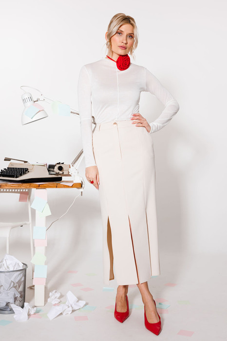 Женственная модель на поясе и с высокими разрезами, открывающими ноги в движении. Тонкая, гладкая костюмная поливискоза подходит для повседневных образов — эта ткань выглядит презентабельно и благодаря добавлению искусственных волокон долго не утратит своих качеств. Комбинируйте с жакетом из нашей коллекции. Длина с поясом - 92 см.