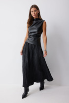 Юбка из эко-кожи на хлопковой основе, расклешенная книзу, на притачном поясе со шлевками для ремня, без подкладки. Переднее полотнище со средним швом, понизу с разрезом. Заднее полотнище с потайной застежкой на молнию в среднем шве. В области бедер обработаны накладные карманы с клапаном. В комплект входит съемный ремень из основной ткани.