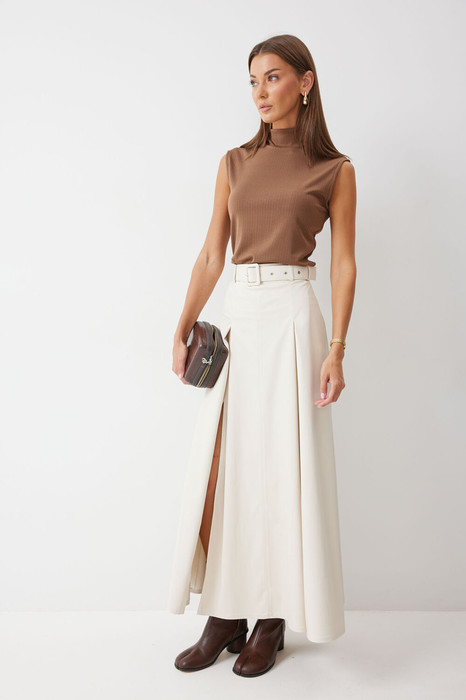 Стильная юбка А-силуэта из экокожи , длины макси. По верху юбки притачной пояс с  шлевками для ремня.  На передних половинках расположены вытачки со встречной складкой и разрезами по низу. На задних половинках расположены талиевые вытачки. На спинке по центру потайная молния. В комплект входит ремень.