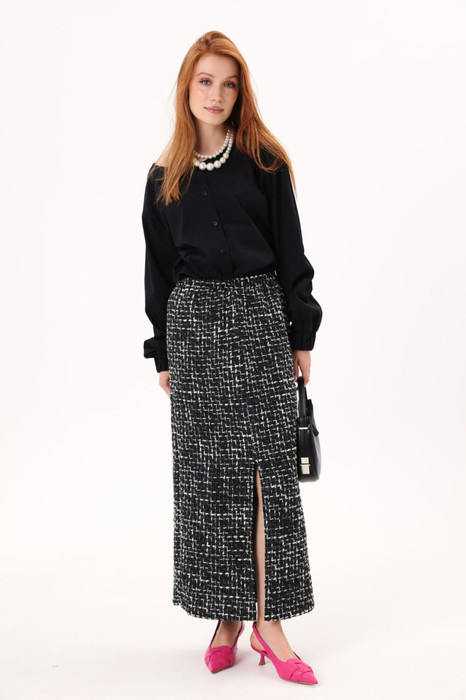 Юбка длиной миди прямая на резинке. Карманы в боковых швах. Разрез по переду.