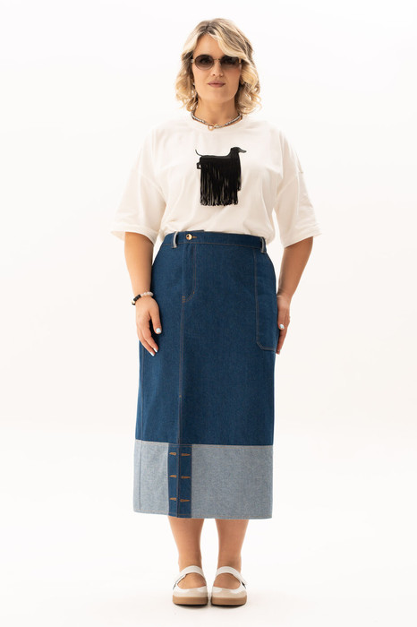 Джинсовая юбка-предмет одежды на все времена,это базовая вещь в гардеробе, которая отлично сочетается с разными стилями и подходит для любого возраста. Эта юбка — воплощение интеллектуального кэжуала. Выполнена из высококачественного джинса - очень приятна к телу. Главные особенности модели: двухцветный дизайн с контрастным светлым подолом, который визуально облегчает силуэт, притачной пояс со шлевками, функциональные накладные карманы и оригинальная застежка-гульфик, смещенная в сторону. Асимметричная планка с пуговицами и смещенная вправо застежка добавляют образу динамики и делают привычный деним ультрамодным. Юбка предназначена для создания разных силуэтов и позволяет экспериментировать с образами. Благодаря высокой посадке, она идеально садится по фигуре. Отлично подходит для работы, прогулок или вечернего выхода. Идеальный выбор для тех, кто ищет базу с характером. Юбка подходит, как к нарядной блузой под каблучок, так и под спортшик , кеды и высокие сапоги.