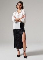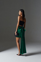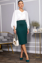 Юбка прямая на подкладке, до середины колена на поясе, с резинкой по бокам. Застежка в среднем шве спинки на пуговицу и молнию, по спинке шлица.