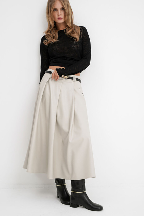 Детали: притачной пояс со шлевками, прорезные карманы, застежка на потайную молнию в левом боковом шве, юбка на подкладке.