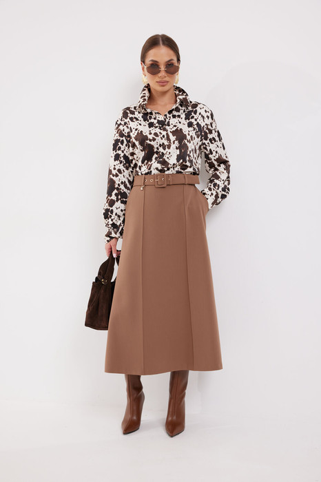 Роскошная юбка А-образного силуэта выполнена из костюмной ткани на подкладке. Модель с отстроченными вертикальными стрелками, в боковых швах функциональные карманы. По задней половинке юбки декоративные карманы в рамку. Застежка в боковом шве на потайную молнию и пуговицу. Съемный пояс выполнен из основной ткани юбки.