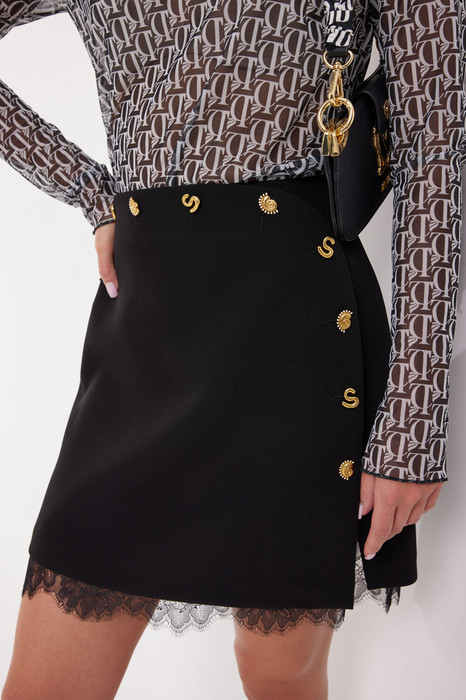 Юбка женская на подкладке, длиной мини. Юбка имеет слегка расширенную к низу форму, переднее полотнище из двух частей с имитацией запаха и застежки на декоративные пуговицы. Подкладка юбки с красивой кружевной деталью по низу, кружево на 3-4 см «выглядывает» из-под нижнего края юбки. Застежка в боковом шве на потайную застежку-молнию. Верхний край юбки обработан обтачкой, по заднему полотнищу обработаны талиевые вытачки. Длина 47 см.