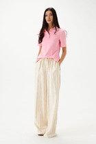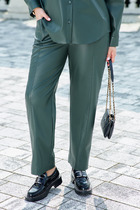 Стильные женские брючки на поясе с завышенной линией талии. Модель прямого кроя, на поясе — молния с клепкой, по бокам вшита резинка, имеются два боковых кармана.