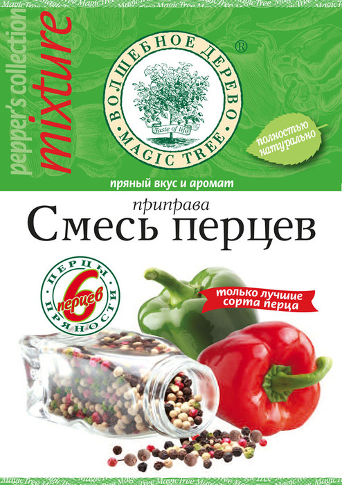 Эта смесь содержит сбалансированное сочетание 6 перцев: черного, красного, белого, душистого, зеленой и красной паприки. Мы особенно рекомендуем добавлять смесь к мясу, курице на гриле или шашлыкам