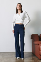 Свободные женские брюки со стрелкой и боковыми карманами из плотного гладкого трикотажа интерлок. Застежка на кнопку. Низ обработан плоскими швами.