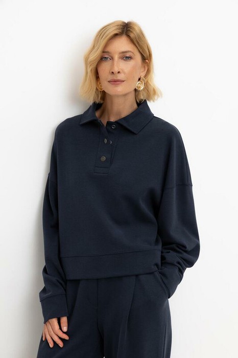 Джемпер-поло из высококачественного трикотажного полотна. За счет фактуры переплетения и специальных обработок сохраняют силуэт и форму. Хлопок в составе добавляет комфорт при носке. Выделяется благодаря спущенной линии плеча, что отличает его от традиционных моделей. Широкие манжеты и пояс формируют расслабленный стиль.