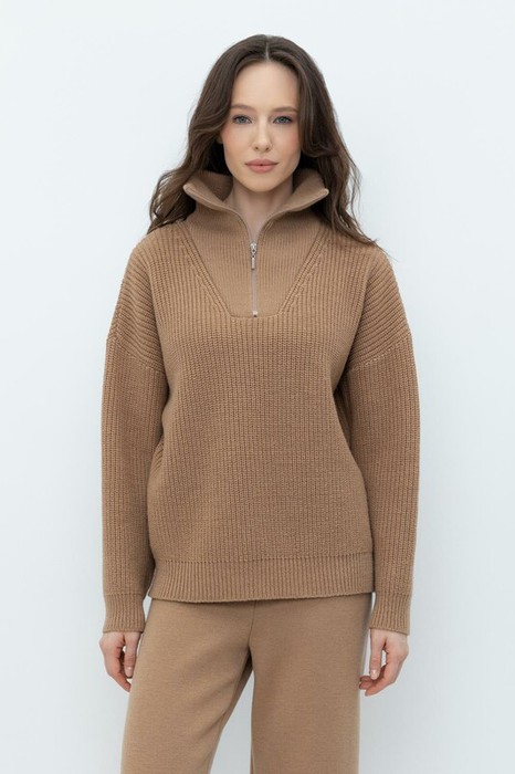 Уютный джемпер в стиле оверсайз со спущенным плечом и объемными рукавами из полушерстяной пряжи. Воротник-стойка застёгивается на молнию.