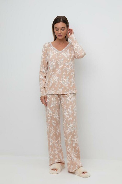 Легкий комплект для комфортного сна и отдыха набивного трикотажа с нежным рисунком из 100% натурального хлопка. Джемпер с V-образным вырезом, украшенный эластичным кружевом комфортно садится по фигуре. Брюки с поясом на резинке и атласной лентой. Гладкий материал приятен к телу и позволяет коже дышать.