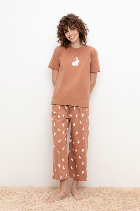 Комплект для сна и отдыха из натурального хлопка с добавлением лайкры. Футболка стандартной длины с принтомкомфортно садится по фигуре. Укороченные просторные брюки с карманами из набивного трикотажа с мягким поясом на резинке.