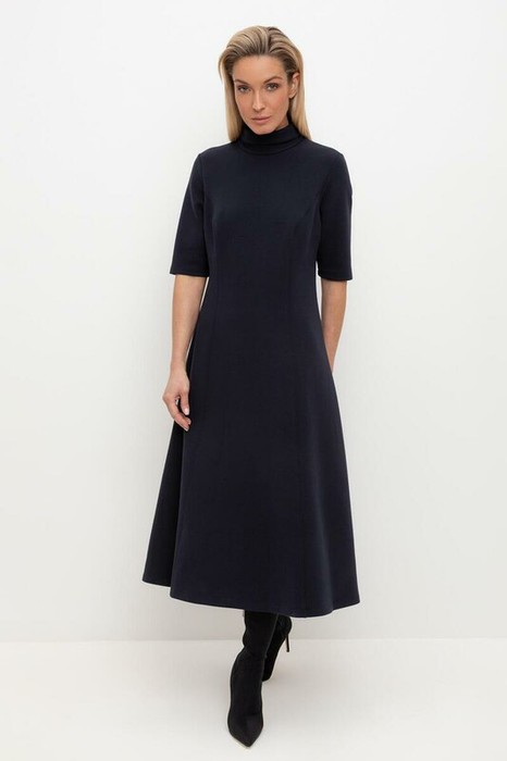 Платье с воротником-стойкой и короткими рукавами из плотного трикотажа интерлок.