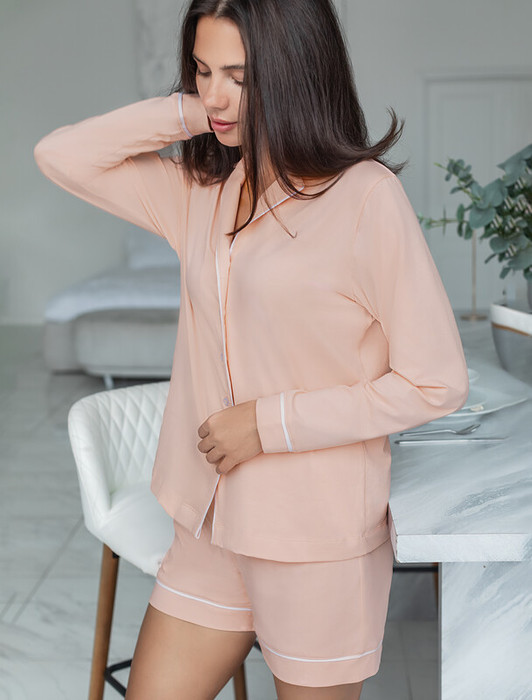 Блузка с английским воротом и длинным рукавом выполнена из эластичного хлопка. Модель дополнена контрастным кантом. Самые мягкие волокна премиального хлопка гарантируют непревзойденный комфорт в течении всего дня. Эластан в составе изделия, поддерживает форму и препятствует сминаемости. Сочетается в костюме с шортами D48.006 и брюками D44.120