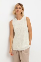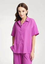 Свободный крой блузки и спущенная линия плеча дарят ощущение легкости и непринужденности, делая образ одновременно женственным и современным. Широкие рукава средней длины гармонично дополняют образ и идеально подходят для полных рук, обеспечивая комфорт, свободу движений и уверенность. Аккуратная застежка на маленькую пуговицу добавляет утонченности, а круглый вырез красиво обрамляет шею, создавая аккуратную линию декольте.