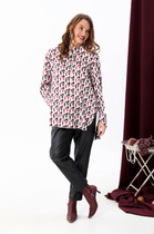 Свободный крой блузки и спущенная линия плеча  дарят ощущение легкости и непринужденности, делая образ одновременно женственным и современным. Широкие рукава средней длины гармонично дополняют образ и идеально подходят для полных рук, обеспечивая комфорт, свободу движений и уверенность. Аккуратная застежка на маленькую пуговицу добавляет утонченности, а круглый вырез красиво обрамляет шею, создавая аккуратную линию декольте.