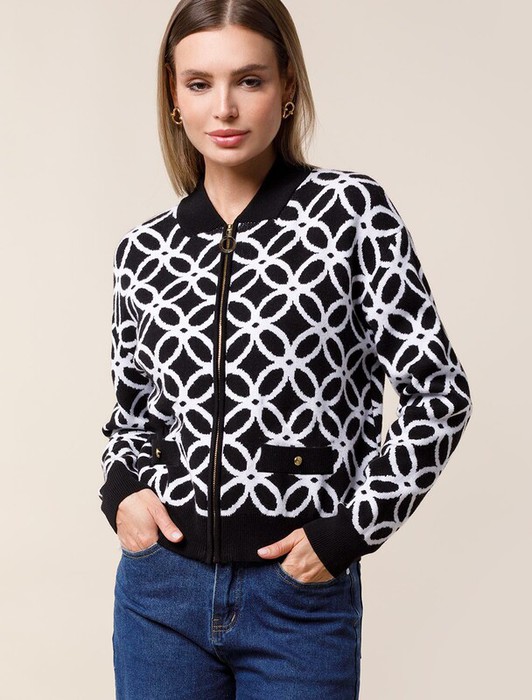 Бомбер жаккардовой вязки выполнен из нежной пряжи на основе вискозы с добавлением кашемира. Мягкая модель с золотистой фурнитурой не раздражает кожу, приятно ощущается на теле и поддерживает комфортный микроклимат. Совет стилиста: трендовая модель эффектно впишется в сдержанный образ, добавив образу выразительности. Сочетайте с однотонными брюками, юбкой, платьем или джинсами