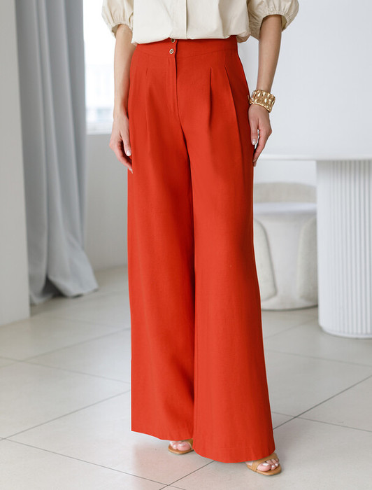 Брюки выполнены из плотного лиоцелла. Модель дополнена карманами и высоким поясом на пуговицах. Ткань изделия отлично держит форму, плавно драпируется и не просвечивает. В теплое время года приятно охлаждает кожу. Добавление синтетических волокон в составе изделия, предотвращает сминаемостьи поддерживает формоустойчивость. Брюки сочетаются в костюме с топом D23.063 и блузкой D29.266, D29.267 и жилетом D27.002