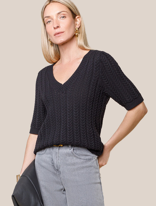 Джемпер фактурной вязки выполнен из хлопка с добавлением кашемира. Модель с V-вырезом с вывязанным орнаментом цепи. Мягкая и очень приятная пряжа совершенно не колется, сохраняет тепло при этом не перегревая, гарантируя безупречный комфорт.