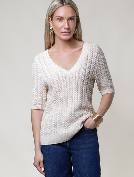 Джемпер фактурной вязки выполнен из хлопка с добавлением кашемира. Модель с V-вырезом с вывязанным орнаментом цепи. Мягкая и очень приятная пряжа совершенно не колется, сохраняет тепло при этом не перегревая, гарантируя безупречный комфорт.