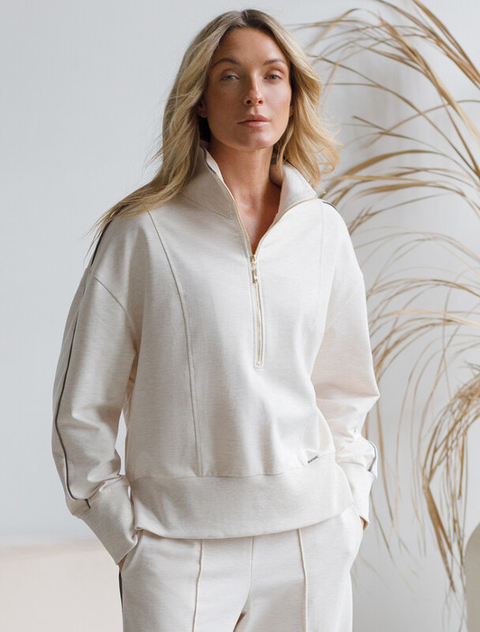 Джемпер с воротом на молнии выполнен из эластичного футера двухнитки. Модель умеренно свободного кроя. По рукавам и воротнику кант из футера контрасного цвета. Изделие дополнено золотистым логотипом бренда. Сочетается в костюме с брюками D44.141, D44.142, шортами D48.009 и юбкой-шортами D46.041. Правила ухода: использовать жидкое моющее средство (гель для стирки), добавлять к нему кислородный пятновыводитель для цветных вещей, и салфетки (защита от окрашивания). Стирка при 30 градусах, отжим на максимальных оборотах.